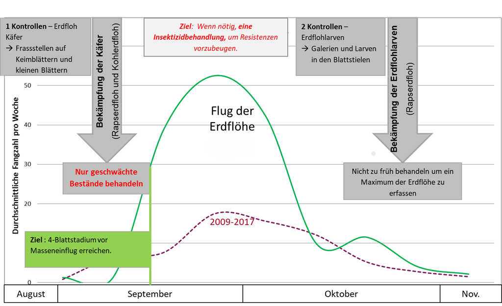 Eine Behandlung der Larven gegen Ende der Saison (Ende Oktober bis Mitte November), wenn die Temperaturen kühl sind, ist wirksamer als die Behandlung gegen adulte Rapserdflöhe (siehe Grafik unten).