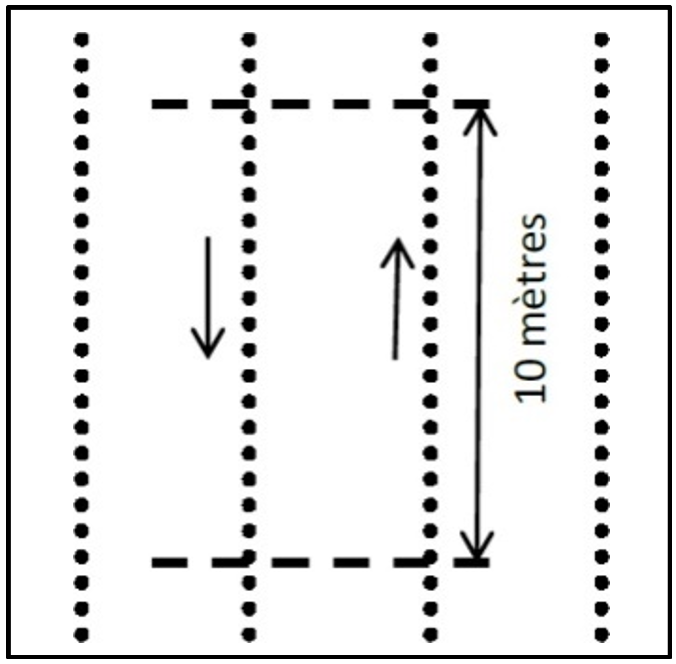 Méthode de comptage : on compte toujours le nombre de betteraves saines sur deux rangs voisins sur une longueur de 10 mètres, soit au total 20 mètres linéaires. En multipliant par 1'000 le nombre de plantes recensées, on obtient le peuplement par hectare (schéma). Un remplacement de la culture est à envisager si le peuplement ne dépasse pas 40'000 plantes par ha.