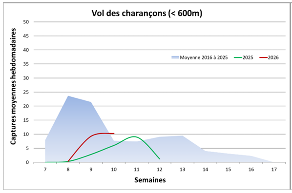 Captures hebdomadaires moyennes du charançon de la tige du colza à moins de 600m d'altitude.
