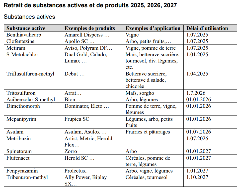 Le tableau suivant présente un aperçu des substances actives retirées.