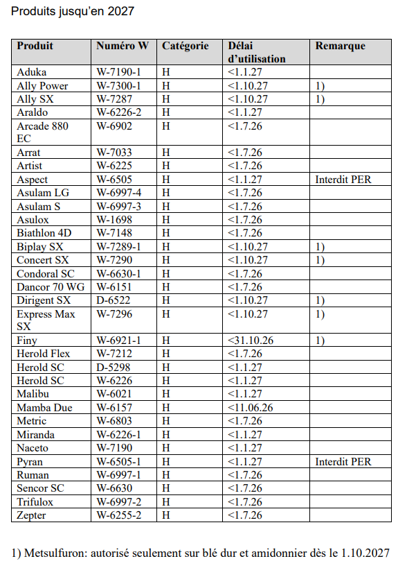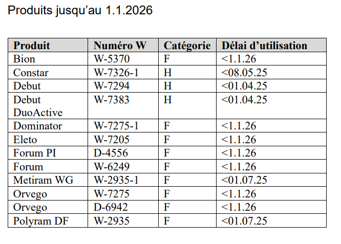 Le tableau suivant donne une liste indicative des principaux produits dont le délai d'utilisation expire au 1er janvier 2026.